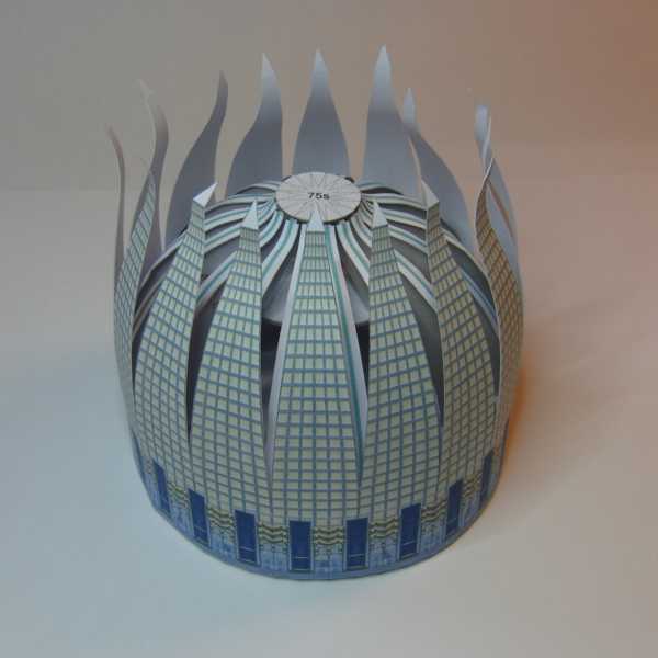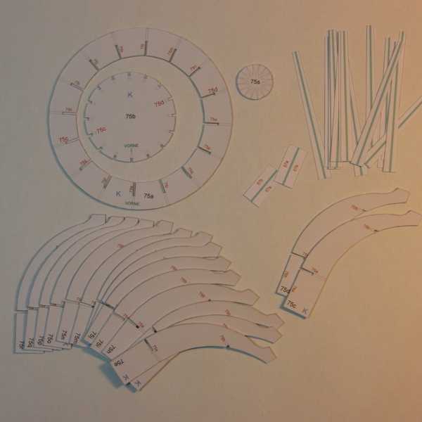 Die mit Karton verstärkten Teile 75a, 75b, 75c und 75d, 75e bis 75r und 75s ausschneiden. Die Teile 76a und 76b unten auf die Kante von 75c und 75d kleben. Die Teile 76c bis 76r jeweils auf den Außenbogen der Teile 75c bis 75r kleben. Der Reihe nach die Teile 75c bis 75r von innen in den Ring 75a schieben und festkleben. Anschließend Teil 75b an den gekennzeichneten Stellen einschieben und festkleben. Aus Teil 76s ein Röllchen formen und oben mit den Teilen 75c bis 75r verkleben. Abschließend Teil 75s aufsetzen (Bogen 16).